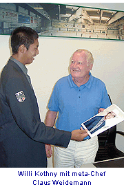 RENGSDORF: Der Koblenzer Säbelfechter Willi Kothny wurde von seinem Sponsor Claus Weidemann von der Firma meta nach Sydney verabschiedet. Kothny unterzeichnete im Beisein der Westerwälder Presse und Kanal 10 aus Koblenz ein Portraitfoto im Olympiaanzug und dankte dem meta-Chef für die finanzielle Unterstützung der letzten Jahre.