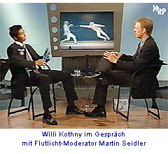 Im Gespräch mit Flutlicht-Moderator Martin Seidler er- klärte Kothny, sich jetzt erstmal um das Abitur kümmern zu wollen, denn im Gegensatz zu anderen Sportarten könne ein Fechter von seinen sportlichen Er- folgen nicht leben. Einige Zeit möchte Willi jetzt pausieren und über seine berufliche und sportliche Zukunft nachdenken. Was den Verbleib in der Fechtgemeinschaft angeht, sind nach Ansicht des zweifachen Medaillengewinners noch einige Gespräche mit Trainer Mehl, Funktionären der FG und seinem Vater nötig. Aber das will der 21 Jährige nicht übers Knie brechen.