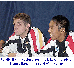 Bonn: Die Koblenzer Säbelfechter Willi Kothny und Dennis Bauer sind offiziell für die Europameisterschaften in Koblenz nominiert worden. In der deutschen Rangliste steht Kothny vor Bauer auf Platz eins, in der Welt- rangliste rangieren die beiden Bronzejungs von Sydney auf Platz 5 (Kothny) und 18 (Bauer).
