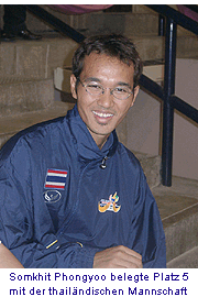 Bangkok: Der Trainer des FKC Koblenz, Somkhit Phongyoo, bele- gte bei den Asienmeisterschaften mit der thailändischen Säbel- mannschaft Platz fünf. Im Kampf um den Einzug ins Halbfinale unterlag Thailand dem späteren Asienmeister aus der Volksrepublik China. Für Thailand gingen neben Phongyoo an den Start: Top Sares, Chat und Kancha. Keiner dieser Fechter verfügt über Weltklasseniveau, sodass Siam mit Rang 5 hoch zufrieden sein musste. Da die asiatischen Fechtnationen China und Korea bei den Südostasienspielen im Herbst nicht an den Start gehen, rechnet der thailändische Fechtverband fest mit einer Medaille.