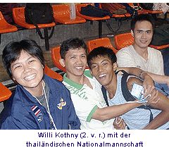 Eine Lösung des Problems könnte in einigen Jahren Somkhit Phongyoo bringen. Der 23-Jährige trainiert in- zwischen seinen Bruder Willi Kothny, den zur Zeit erfolg- reichsten Säbelfechter Deutschlands. Mit welchem Einsatz er dies tut, kann auch am Trainingsprogramm des FKC abgelesen werden. Vom ersten Tag an ist die neue Saison bis zur WM in Portugal für alle Alters- klassen durchgeplant. Bis zur Trainerreife fehlen dem Thailänder alledings noch einige Fecht-Lehrgänge beim DFB und die Trainer- akademie in Köln. Über die nötige Erfahrung verfügt der Kothny-Trainer, coacht er doch als jüngster Säbeltrainer Deutschlands bereits die Nr. 3 der Weltrangliste.