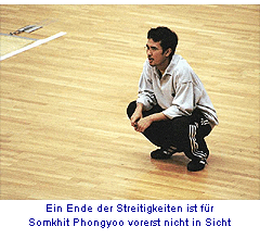 Eine von der Vorsitzenden vorgeschlagenen gütlichen Einigung lehnte Monika Sauer ab; ihr Anwalt forderte im Gegenzug, Phongyoo möge seine Klage zurückziehen und die Kündigung anerkennen. Dies aber lehnte Phongyoo ab, der im übrigen mit einer Beendigung des Arbeitsverhältnisses im beiderseitigen Einvernehmen einverstanden war. Der jüngste Leistungstrainer Deutschlands fühlt sich als Opfer in einer sportpolitischen Auseinandersetzung, in der es nicht um Sportler, sondern um das Prestige von Funktionären geht. Er sei unverschuldet in deren Schusslinie geraten, als er seinem Bruder aus rein familiären Gründen half, das Säbeltraining fortzusetzen, nachdem ihn sein alter Trainer entlassen hatte - doch das interessiert das Gericht erst, wenn die Klage zugelassen wird. Kann sein, dass Phongyoo nie zu Wort kommen wird.