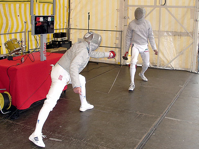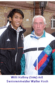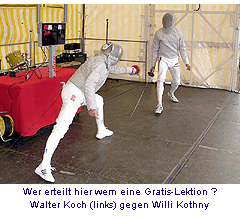 Osnabrück: Na, hätten Sie Lust, fechten zu lernen ?, drückte ein als Musketier kostümierter Jungfechter beim Bahnhofsfest in Osna- brück dem zweifachen Bronzemedaillengewinner Willi Kothny ein Faltprospekt des OSC in die Hand und schickte sich an, den Einladungs-Stapel zum Schnupperkurs für Erwachsene loszu- werden. Minuten später konnte das Fechtküken dann Willi Kothny auf der Planche bewundern, wie er dem 64-jährigen deutschen Seniorenmeister Walter Koch bei einem Showkampf die Treffer nur so um die Ohren haute.