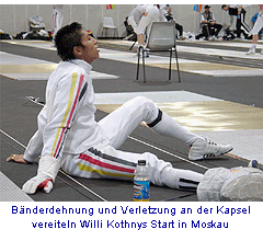 Berchtesgaden: Fechter Willi Kothny hat sich am Sams- tag beim Training der Säbel-Nationalmannschaft verletzt. Ohne Einwirkung eines Gegners knickte er beim Training beim abschliessenden Fussballspiel um und zog sich eine starke Bänderdehnung und eine Verletzung der Kap- sel zu. Erst am heutigen Mittwoch konnte endgültig ge- klärt werden, dass keine Sehne gerissen war. Der Olym- piadritte von Sydney hat das einwöchige Training in Berchtesgaden abgebrochen und befindet sich in Kob- lenz in physiotherapeutischer Behandlung. Die Verletz- ung ist so schwer, dass Kothny den Weltcup in Moskau Ende nächster Woche absagen musste. Das Turnier gilt als Generalprobe für die am 26. Oktober in Nîmes stattfindende Weltmeisterschaft.
