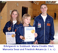 Sulzbach Rosenberg: Marie-Christin Steil vom Fecht- und Kampfsport Club Koblenz landete beim Internationalen Säbelturnier von Sulzbach den ersten internationalen Turniersieg ihrer Karriere. Das Bayerische Qualifikations- turnier der A-Jugendlichen sah eine Marie Steil, die nur in der Vorrunde beim ersten Kampf Unsicherheiten aufkom- men liess, sich dann aber an die Worte ihres Trainers Somkhit Phongyoo erinnerte, sich auf ihre Stärken zu besinnen. Ab dem zweiten Gefecht kämpfte Steil wie verwandelt, zog alle Register ihres Könnens und liess keiner Gegnerin auch nur den Hauch einer Chance. Sogar im Finalkampf putzte sie ihre Gegnerin Patricia Payome aus München mit 15:9 weg.