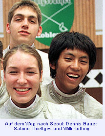 Koblenz: Hans Peter Schössler von der Toto-Lotto Rhein- Am Sonntag reiste die kleine Koblenzer Delegation unter Leitung von Trainer Eberhard Mehl nach Frankfurt, wo sie auf dem Flug- Auf ihre Chancen hin befragt, meinte Säbelfechterin Sabine Thieltges: Allein die Teilnahme ist Erfolg genug. Willi Kothny wollte erst mal in Ruhe sein Brötchen fertig essen und dann Trainer Eberhard Mehl traut indes allen Koblenzern Finalchancen zu: Die Athleten haben eine Bomben- Die Wettkämpfe beginnen Anfang November. Eine Woche ist für die Aklimatisierung in Seoul vor- |