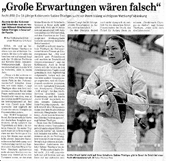 Da ihre Diszilpin derzeit noch nicht olympisch ist, entfällt für die deutschen Säbel-Frauen zudem der Druck, das Ticket nach Sydney lösen zu müssen. Direkt nach Olympia zu dürfen, sagt Sabine Thieltges, wäre wohl doch des Guten zuviel. |