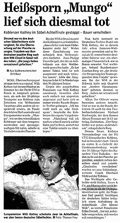 ![]() Koblenzer Kothny im Säbel-Achtelfinale gestoppt - Bauer verschoben Bericht von Dirk Kurz in der Rhein-Zeitung, 06.11.1999 Seoul: Diesmal war es den deutschen Säbelfechtern nicht vergönnt, für eine Überraschung auf der Planche zu sorgen. Trotzdem war Bundestrainer Joachim Rieg nach dem WM-Einzel in Seoul voll des Lobes: Die Jungs haben sensationell gefochten.