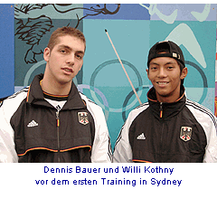 Sydney: Die Koblenzer Säbelfechter Dennis Bauer und Willi Kothny absolvierten heute ihre erste Trainingseinheit in Sydney. Eberhard Mehl forderte Konditionsübungen ab, um das Jetlack-Syndrom zu kurieren. Alle bis auf Willi Kothny litten unter der Zeitverschiebung. Dennis Bauer, Eero Lehmann und Alexander Weber wirkten müde. Mehl: Wenn die mein Training hinter sich haben, können sie gut schlafen und sind morgen fit. Am Freitag steht denn auch Krafttraining auf dem Programm, und da kennt der Koblenzer Trainer sowieso kein Pardon.