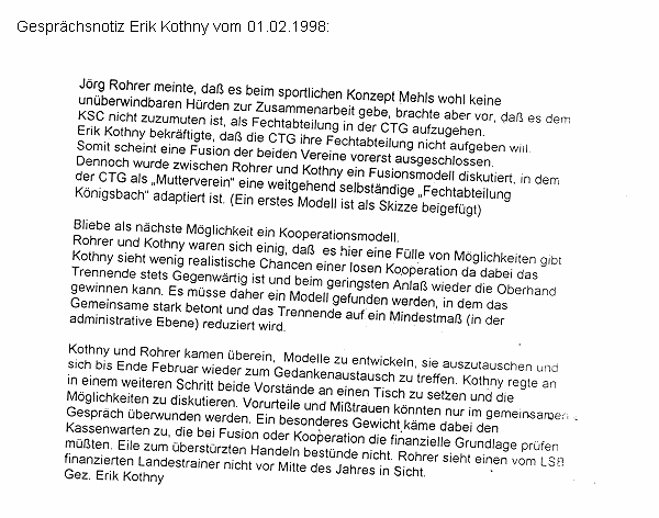 Kothny und Rohrer erarbeiteten in mehreren Gesprächen die Grundzüge einer Kooperation / Fusion. Unabdingbare Voraussetzung für eine Zusammenarbeit für Kothny war die Übernahme des Trainingskonzept von Eberhard Mehl im Bereich Kondition, Kraft, Schnelligkeit und Ausdauer. Kothny: Vor einer Kooperation müssen die Trainingskonzepte der Säbeltrainer aufeinander abgestimmt werden. Zeitnot gab es für die CTG nicht - wohl aber für den KSC, den rund 20 - 30 TDM Schulden drückten. Die Bezahlung eines hauptamtlichen Trainers ab 1999 war gefährdet.