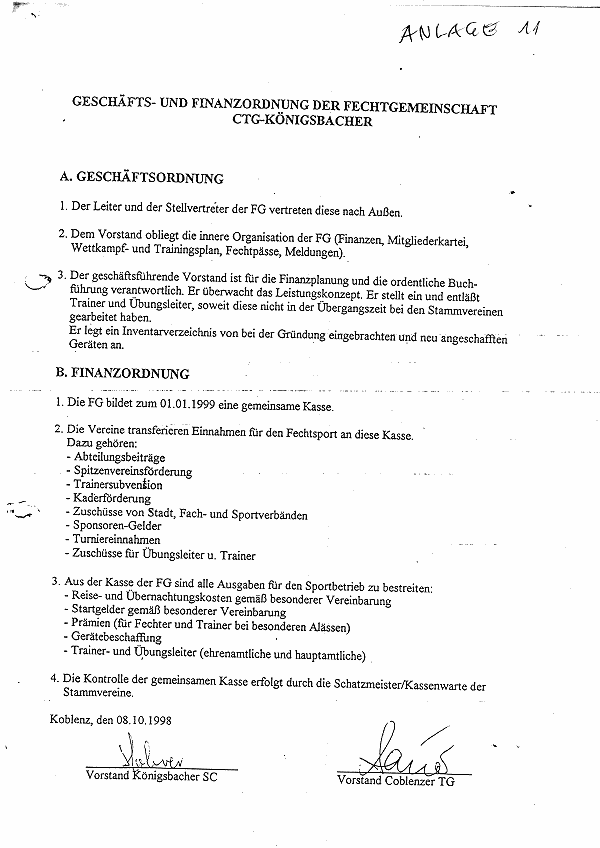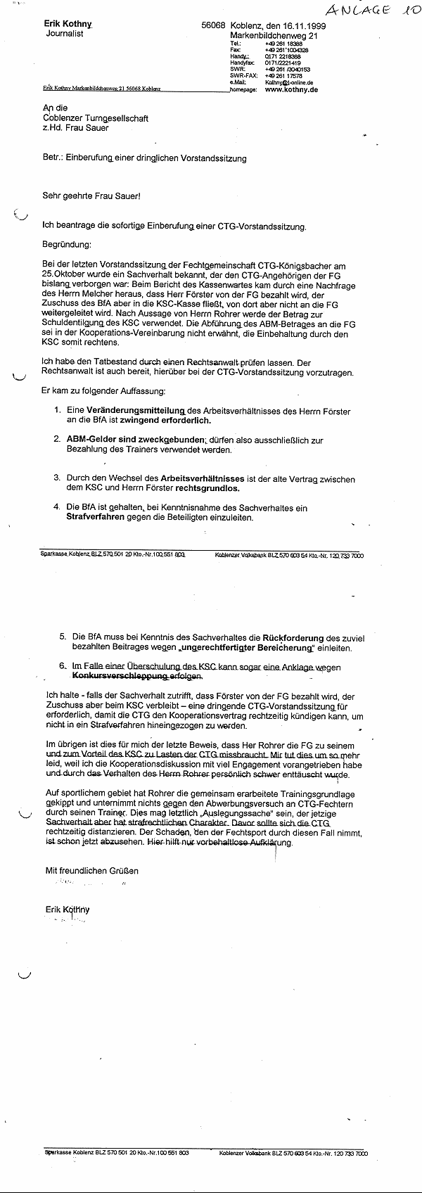 In der Vorstandsitzung am 25.10. kam durch eine beiläufige Nachfrage von Hans Melcher heraus, dass ABM-Mittel für den FG-Trainer Förster nicht in die FG-Kasse, sondern an den KSC wie mit Frau Sauer besprochen (Rohrer) zur Schuldentilgung flossen. Ich konsultierte einen Rechtsanwalt, beantragte bei Monika Sauer eine CTG-Vorstandssitzung (Antrag Kothny), weil dieser ABM-Transfer in Höhe von ca. 20.000,00 DM weder Gegenstand des Kooperationsvertrages, noch der Finanzordnung war. Im Gegenteil, es war vereinbart, dass Zuschüsse und Subventionen für die Vereine in die gemeinsame FG-Kasse zu transferieren waren gemäss Geschäfts- und Finanzordnung.