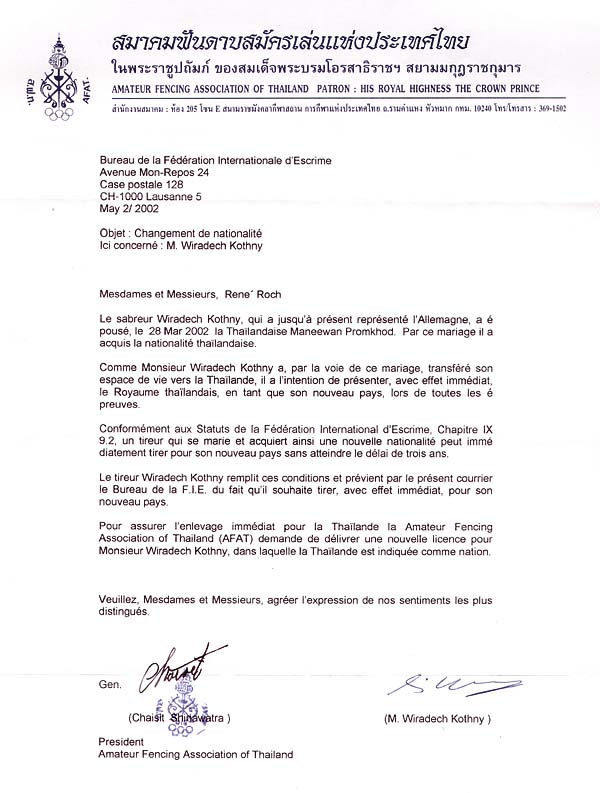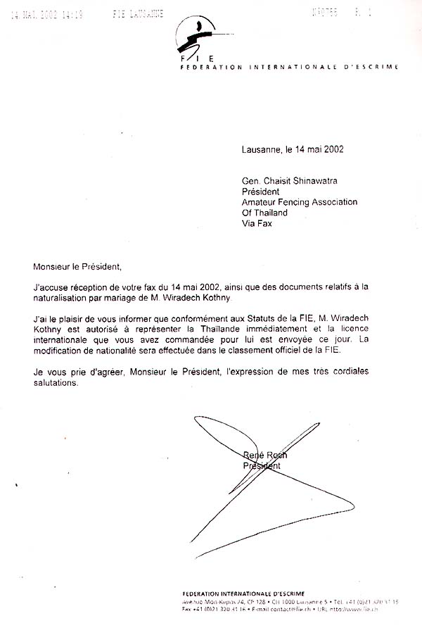 Wegen der bevorstehenden Asienspiele erkundigt sich der kuweitische Generalsekretär bei FIE-Präsidiumsmitglied Max Geuter über eventuelle Auslegungen des Reglements bei einem Wechsels. In seiner Antwort bescheinigt Geuter, dass bei gewissen Voraussetzungen ein Wechsel ohne 3-Jahres-Sperre möglich ist: ...the rules in the statuts ... are very clear.