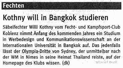 Beim Weltcup in Bonn belegt Willi Kothny Platz 9 und ist bester deutscher Fechter. Nach dem Gefecht verlangen Teamchef Matthias Behr, Bundestrainer Jochen Rieg und Sportdirektor Klaus Janka eine sofortige Entscheidung von Willi. Der sagt: Er sei in Thailand geboren, er lebe in Thailand, er studiere in Thailand, sein Trainer sei in Thailand, früher oder später werde auch er in den thailändischen Fechtverbvand wechseln. Die DFeB-Oberen einigten sich mit Willi, in Frieden auseinanderzugehen und dass Kothny nicht mehr als deutscher Kaderfechter geführt werde. (Meldung vom Weltcup)