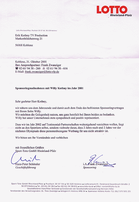 Auf dem sportlichen Höhepunkt seine Karriere (Nr. 3 der Weltrangliste) kündigt TOTO-LOTTO in einem Schreiben den Sponsoringvertrag zum Jahresende.