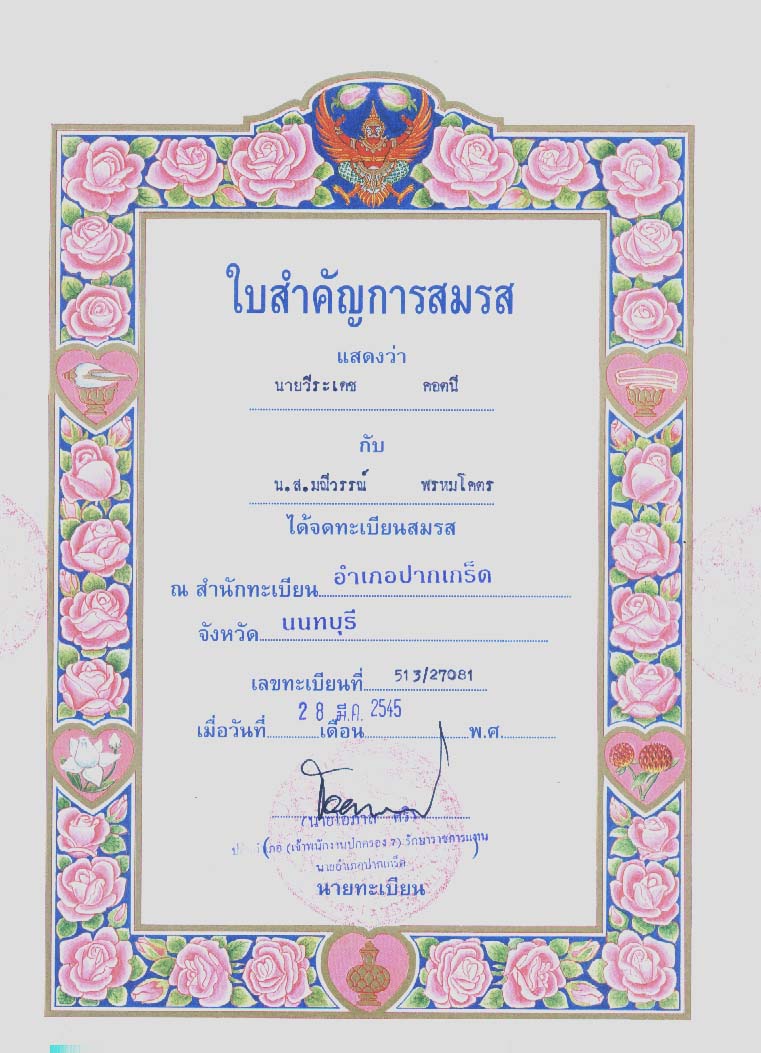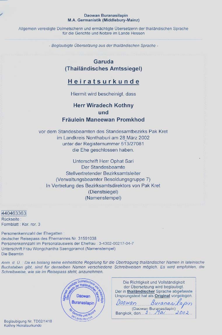 Willi heiratet eine Kommilitonin und beantragt die thailändische Staatsbürgerschaft. (Heiratsurkunde thai, Heiratsurkunde deutsch)