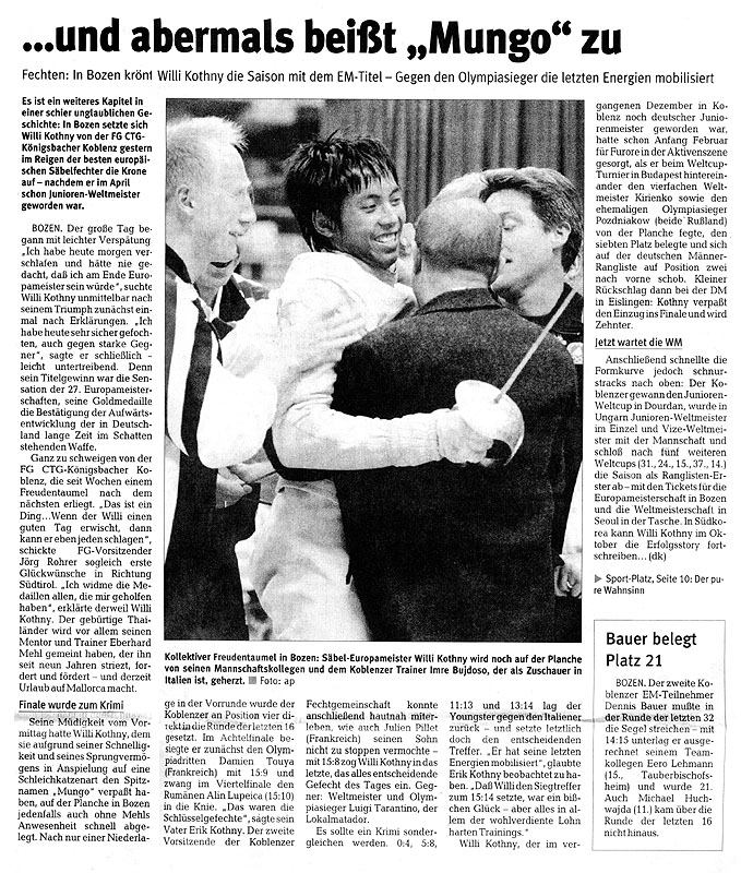Andere herausragende und bedeutungsvolle Momente sollen folgen. Die Fachholschulreife auf dem Gymnasium (12. Klasse) erlangt, läßt sich Kothny nun für ein Jahr beurlauben, in dem er den Zivildienst absolviert. Doch für das Fechttraining in Hinblick auf Weltmeisterschaft und Olympische Spiele wird er freigestellt. De facto ist der Kämpfer in den nächsten zwölf Monaten nur in Sachen Säbelfechten unterwegs. Nach Sydney mache ich dann das Abitur erklärt Wiradech, der nichtsdestotrotz ab sofort in den schwächeren Fächern (Biologie und Mathematik) Nachhilfeunterricht bekommen wird.