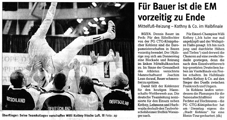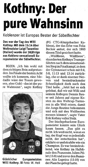 In Bozen bewies er, allemal bis 15 zählen und fechten zu können. Mein Triumph zeigt auf, daß in Deutschland auch bei den Säbelfechtern sehr gute Nachwuchsarbeit geleistet wird sagt er über seine Disziplin sinnierend. Die Jugend kommt, man merkt es. Wer es nicht bemerkt haben sollte, der möge sich bei Luigi Tarantino - immerhin schon 26 Jahre alt - informieren.