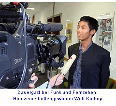 Willi Kothny, der heimlich frühzeitig nach Koblenz zu- rückgekehrt war, ist inzwischen Dauergast bei TV und Hörfunk. Heute ist er als Interviewpartner bei der Mainzer Landesschau geladen (19:20 Uhr). Auch bei RPR und Radio Koblenz wurde er als Studiogast interviewt. Den ganz grossen Auftritt nach Olympia in der heimischen Öffentlichkeit aber wird Kothny zusammen mit Mann- schaftskamerad Dennis Bauer am 11. Oktober beim Empfang der Stadt Koblenz im Weindorf haben.