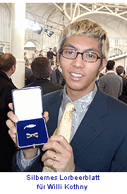 Königswinter: Willi Kothny wurde heute von Bundespräsident Johannes Rau auf dem Petersberg mit dem silbernen Lorbeerblatt ausgezeichnet. Erster Gratulant war Bundeskanzler Gerhard Schröder, ehe Innenminister Otto Schilly zum Mittagessen ins Gästehaus der Bundesregierung lud.