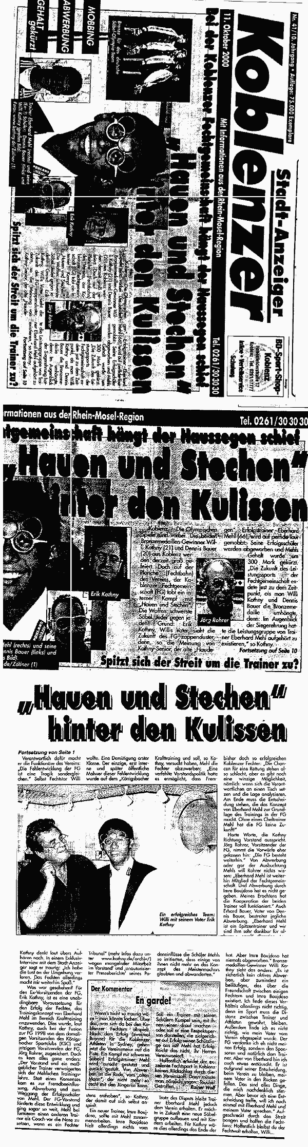Der Victoria Fair Play-Preisträger Willi Kothny hatte bereits nach Olympia angekündigt, die Koblenzer Fechtgemeinschaft zu verlassen, falls sich an der Vereinspolitik nichts ändere (siehe Bericht im Koblenzer Stadt-Anzeiger, 11.10.2000). Statt eines Gespräches mit dem Vorzeigeathleten schalteten die FG-Funktionäre auf stur. Es hagelte Repressalien:
