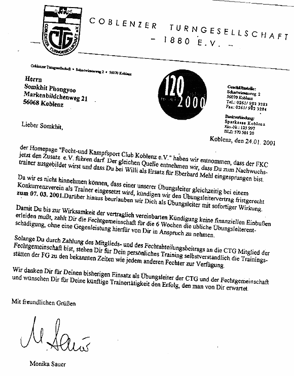 24.01.2001: Dem unbescholtenen und fleissigen Trainer Phongyoo wurde von Monika Sauer u. a. mit der Begründung gekündigt, weil er als Ersatz für Eberhard Mehl einsprang. (siehe Schreiben vom 24.01.2001)