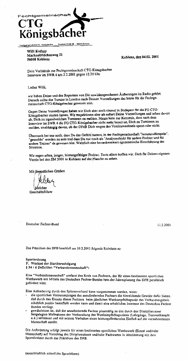 04.02.2001: Willi Kothny wurde eröffnet, dass ihn die FG nicht mehr zu Turnieren meldet. (siehe Schreiben vom 04.02.2001)