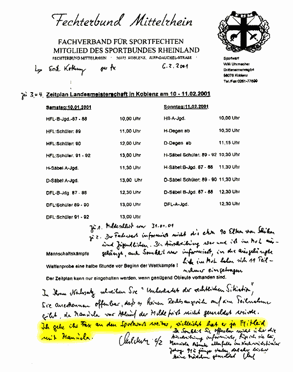 10.02.2001: Willis kleine Schwester war von der FG nicht zur Landesmeisterschaft gemeldet worden, die Nachmeldung durch Geschäftsführer Melcher vom Mitleid des Fachwarts abhängig gemacht. (siehe Schreiben vom 06.02.2001)
