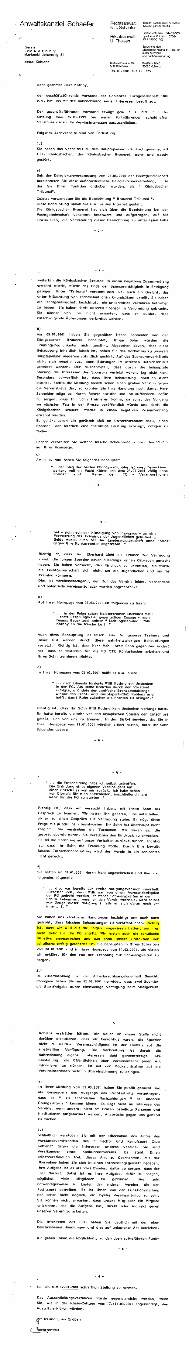 Der geschäftsführende Vorstand der Coblenzer Turngesellschaft liess am 29.03.2001 über die Anwaltskanzlei Schaefer mitteilen, dass die CTG beabsichtige, Erik Kothny wegen fortwährenden schuldhaften Verstoßes gegen die Vereinsinteressen auszuschließen.
