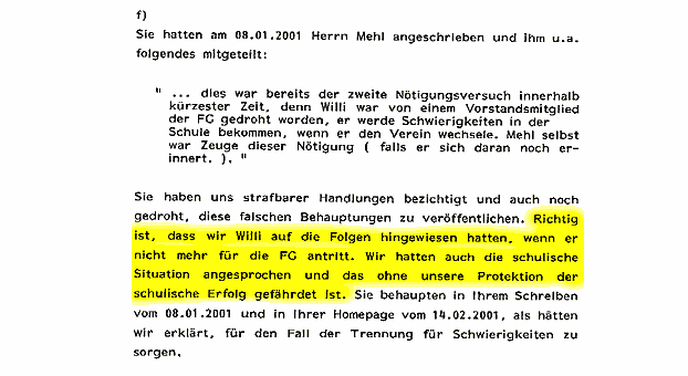 In dem Schreiben weist der CTG-Anwalt unter anderem den Vorwurf Kothnys zurück, Frau Sauer ha- be gedroht, er (Willi) werde Schwierigkeiten in der Schule bekommen, wenn er den Verein wechsele. Weiter heisst es wörtlich: