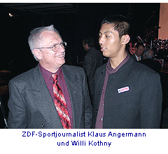 Köln: Willi Kothny war Ehrengast beim 8. Sparkassen- Fair-Play-Preis für Sportjournalismus. Die beiden Moderatoren Monika Lierhaus (Premiere World) und Hazen Bossdorf (ORB) arbeiteten nochmals die verschenkte Olympiamedaille von Willi auf. Mit seiner lockeren Art brachte der Victoria-Fair-Play-Preisträger 2000 den Sall ein ums andere mal zum Lachen. Auch löste sich das Rätsel, wer an Sportbild weitergab, als Willi einer Mutter ihr auf einer Münchener Rolltreppe verloren gegangenes Kind zurückbrachte. Es war der ZDF-Sportjournalist Klaus Angermann.