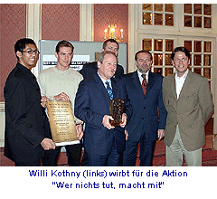 Als Sportler gab Kothny ein Beispiel aus Sydney: Keiner rechnete mit einem Medaillengewinn der Deutschen Säbelmannschaft. Wenn dann aber einer fest daran glaubt, sich voll einsetzt, punktet und die anderen anfeuert, dann springt der Funke auf den schwächsten über - die Mannschaft wächst über sich hinaus. Würde keiner etwas machen, würde eintreten, was man erwartet hat: Mittelmaß. Da es in Sydney aber anders lief, holten wir Bronze.
