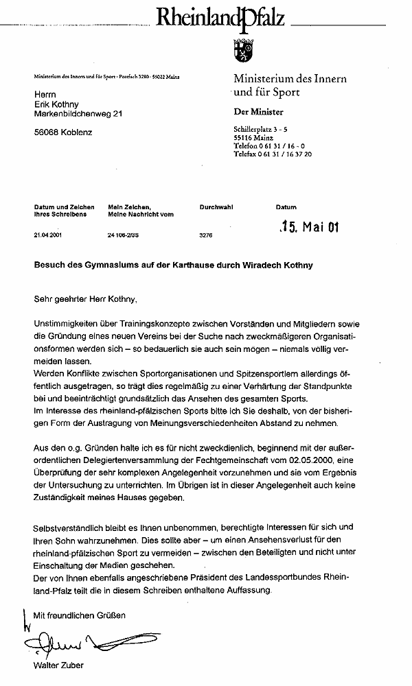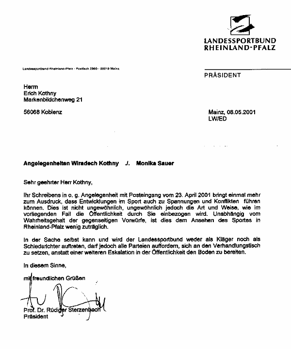 Diese Haltung der höchsten rheinland-pfälzischen Sportbeauftragten wies Kothny Senior zurück (siehe Schreiben vom 07.06.2001) und gab den Fall an die Schulaufsichtsbehörde zur Klärung weiter: Es kann doch nicht sein, dass eine Sportfunktionärin offen von Protektion spricht und dafür weder von der Politik noch vom Sportverband zur Rechenschaft gezogen wird. Wird dieser Fall, so der TV-Journalist weiter, nicht rückhaltlos geklärt, bleibt der fade Nachgeschmack, dass Leistungssportler durch die Schule geschoben werden. Und das wäre tatsächlich für den rheinland-pfälzischen Sport von Schaden.