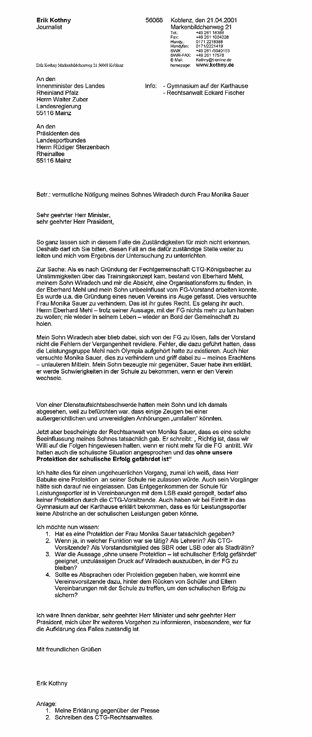 Erik Kothny, Vater und und Manager von Willi, hatte Monika Sauer wegen ihrer Äusserung zum Rücktritt aus ihrer Verbandsfunktion aufgefordert. Nach seiner Einschätzung wollte die CTG-Vorsitzende mit dem Hinweis auf ihre Protektion seinen Sohn vom Vereinswechsel abhalten. Kothny: Ein Skandal von landesweiter Bedeutung. Kothny Senior hatte sich deshalb am 21. April 2001 bei den obersten Sportverantwortlichen, Innenminister Walter Zuber und Landessportbundpräsident Rüdiger Sterzenbach, über das Verhalten der hohen Sportfunktionärin beschwert und um Aufklärung gebeten. Beide, Sportminister wie Sportpräsident, erklärten sich in Schreiben vom 8. Mai (LSB-Präsident) und 15. Mai (Sportminister) übereinstimmend in der Sache für nicht zuständig, und kritisierten ebenso unisono, dass Kothny den Vorgang öffentlich machte.