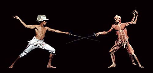 Doch keine Angst, es ist nur der Kampf des Säbelstars mit einem plastifizierten Toten der Ausstellung Körperwelten.