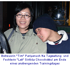 Bangkok/Koblenz/Bonn: Die thailändische Degenfechterin Lek Siritida Choochokkul hat sich in Deutschland gut eingelebt und lässt sich den rauen Trainingswind um die Ohren pfeifen - im wahrsten Sinne des Wortes: Morgens bei nur 5 Grad Aussentemperatur startet sie mit ihrer Betreuerin Tim Pariyanuch Na Tagwatung zum Regenerationslauf. Am Montag und Freitag Nachmittag stemmt die junge Thailänderin im Max-von-Laue Gymnasium Gewichte: Zwei Wochen Muskelaufbau. Dienstag, Mittwoch und Donnerstag geht es per Bahn ins Olympiazentrum nach Bonn. Freifechten gegen Deutschlands Elite - bis zur Erschöpfung. Wenn die beiden Thais gegen Mitternacht wieder in Koblenz eintreffen, reicht die Kraft gerade noch, um ins Bett zu gehen. Nach dem 14-tägigen Krafttraining wird erst auf IK-Schlagtraining umgestellt um 14 Tage vor dem Weltcup in Göteborg Schnelligkeit zu trainieren. Für Erik Kothny, den Manager von Säbelass Willi Kothny kommt der Aufenthalt in Deutschland zu spät, aber vor den Asienspielen im Herbst hat Lek ja noch einmal Zeit, das ganze deutsche Trainingsprogramm in Thailand durchzugehen.