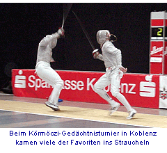 Koblenz: Säbel-Aussenseiter Harald Stehr gewann das Körmöczi-Gedächtnis-Turnier und schob sich in der Deutschen Rangliste auf die WM-Position 4. Der Eislinger besiegte im Endkampf den Koblenzer Steven Bauer mit 15:10. Von den Favoriten konnte nur Michael Herm mit einem dritten Platz einigermassen mithalten.