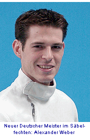 Nürnberg: Alexander Weber vom FC Tauberbischofsheim wurde Deutscher Meister im Säbelfechten. Im Endkampf besiegte er sei- nen Vereinskameraden Mathias Grimm mit 15:9. Der Koblenzer Steven Bauer wurde dritter. Er war an Grimm gescheitert.