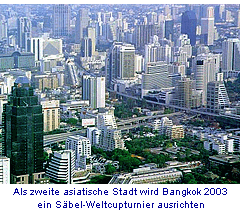Bangkok: Der Wechsel von Willi Kothny zum thailändischen Fechtverband (AFAT) zeigt nun auch erste Auswirkungen auf den Terminkalender der FIE. Erstmals ist in der kommenden Saison ein Säbelweltcup für Bangkok in den Veranstaltungskalender aufgenommen. Er wird am 9. und 10. August 2003 in Siams Hauptstadt ausgetragen und ist nach Teheran die zweite hochkarätige Säbel-Veranstaltung in Asien.