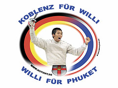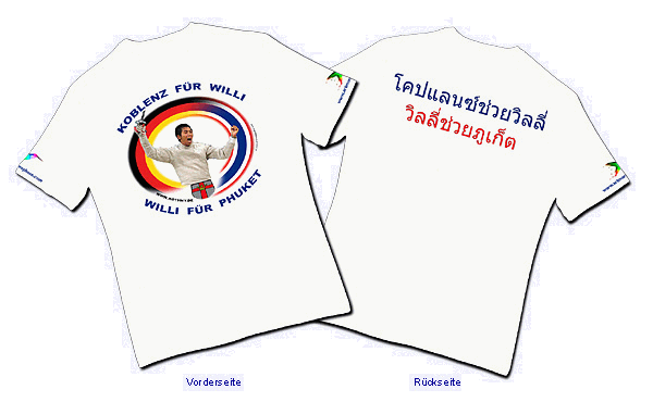 Die Rückseite trägt die Aufschrift Koblenz für Willi - Willi für Phuket in Thai und bleibt auf allen T-Shirts gleich, um den Übersetzungswand so gering wie möglich zu halten.