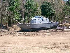 Dieses Boot steht zwei Kilometer vom Strand entfernt, und es ist wohl geplant, es dort als Denkmal stehen zu lassen.