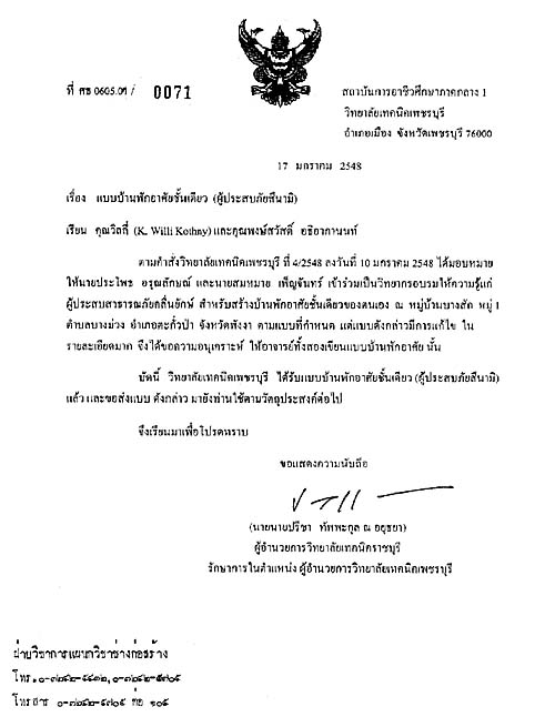 Bahn Bang Sak: Ohne Papiere geht auch bei der Aufbauhilfe nichts. Es ist zum Beispiel nicht möglich, anstelle des weggeschwemmten Hauses einfach ein neues hinzustellen. Dazu braucht man Papiere. Eine Architektenzeichnung der Uni mit Stempel und Unterschrift bedeutete dann aber grünes Licht für die Bautrupps von Bahn Bang Sak. In Thailand sehen diese Papiere so aus: