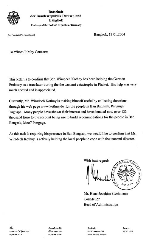 Auch läuft ohne eine offizielle Legitimation wenig. Hier hilft Willi sene deutsche Staatsbürgerschaft. Schneller als jede thailändische Behörde stelte die deutsche Botschaft ein solches Dokument aus. Gedacht zur Vorlage bei der Uni, um von der Anwesenheitspflicht bei Vorlesungen befreit zu werden, ist dieses Dokument auch Türöffner bei Thai-Behörden. Ein Stempel hat eben einfach Durchschlagskraft: