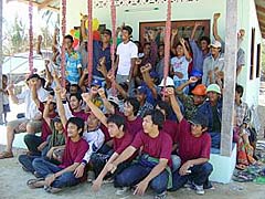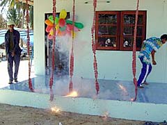 Bahn Bang Sak: Mit einem chinesischen Knall-Feuerwerk wurde das erste fertige Haus an seinen neuen Besitzer, Mr. Ampon mit Familie, übergeben. Das Haus wird auf den Namen Morgan getauft, jenen Seefahrer, den die Meeres- zigeuner als ihren Vorfahren ansehen.