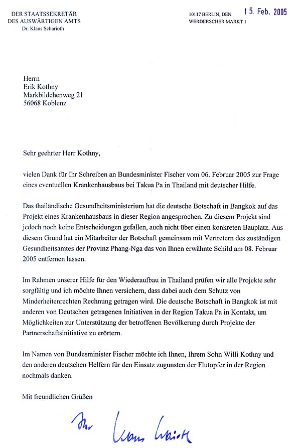 Mittlerweile ist auch das Antwortschreiben aus Berlin eingetroffen. Der Staatssekretär im Auswärtigen Amt bedankt sich und sichert zu, dass Deutschland nicht zulasen wird, dass Morgans wegen eines mit deutschen Geldern finanzierten Krankenhauses aus ihrem angestammten Wohngebieten vertrieben werden:
