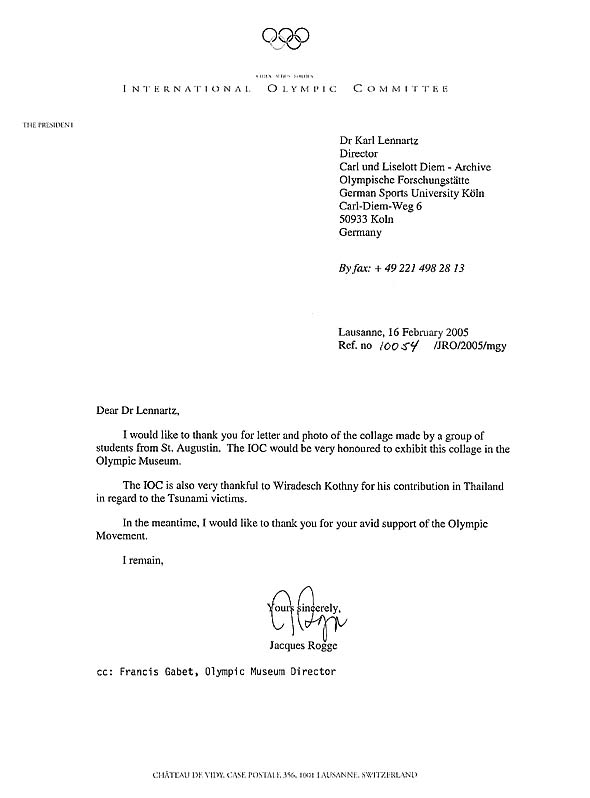 3.800 Euro hat der Stadtsportverband Sankt Augustin an Willi hilft e.V. gespendet. Dr. Karl Lennartz, der 1. Vorsitzende des SSV, hatte anlässlich eines Malwettbewerbs Olympisch leben den IOC-Präsidenten Jacques Rogge auch über Spenden der Sportler/-innen an Willi hilft informiert. Der Präsident dankte in einem Brief sowohl den Sportlern von St. Augustin für ihr Engagement, als auch dem zweifachen Olympiateilnehmer Willi Kothny. Der olympische Gedanke verbindet.