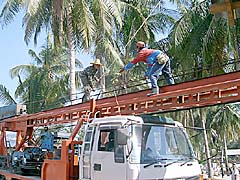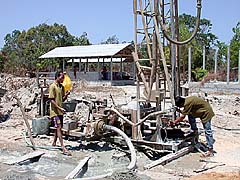 Ein thailändisches Unternehmen ist jetzt zu einem Fixpreis von 10.000 Euro mit dem Bau der Trinkwasserversorgung beauftragt. Mit einer Bohrung wird sauberes Wasser aus 30 Meter Tiefe geholt und in den Wasserbehälter auf einem 12 Meter hohen Turm gepumpt. Von dort läuft es mit ausreichendem Druck in alle Wasserhähne der 30 angeschlossenen Haushalte.