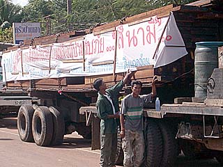 Ban Bangsak: Nach langer Wartezeit ist es endlich da: Das Chorryholz aus Laos, ein besonders hartes und widerstandsfähiges Holz, wie es für den Bau von Booten benötigt wird.