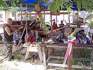 Gebet bevor Arbeitsbeginn. Die Morgans rufen die guten Geister. Das Werkzeug für den Bootsbau wird gesegnet. Den Geistern werden Huhn, Früchte und Reis angeboten.