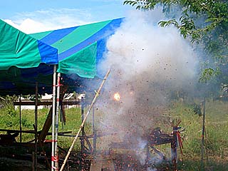 Mit einem chinesischen Knallfeuerwerk werden die bösen Geister vertrieben