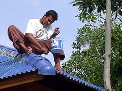 Bemalen der Dachpfannen bei 32° im Schatten. Vorteil: Die Farbe trocknet relativ schnell ;-)